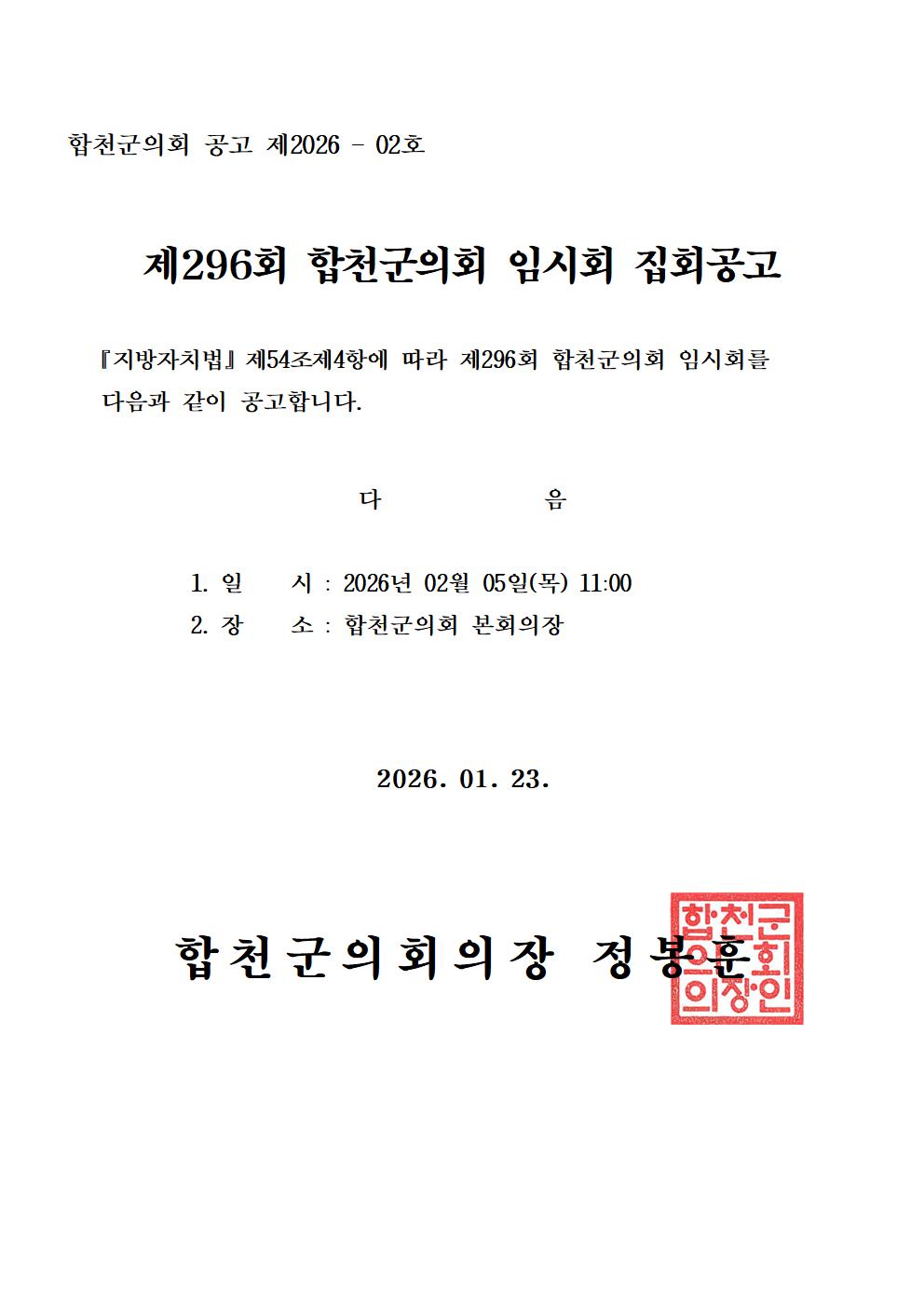 제296회 합천군의회 임시회 집회 공고