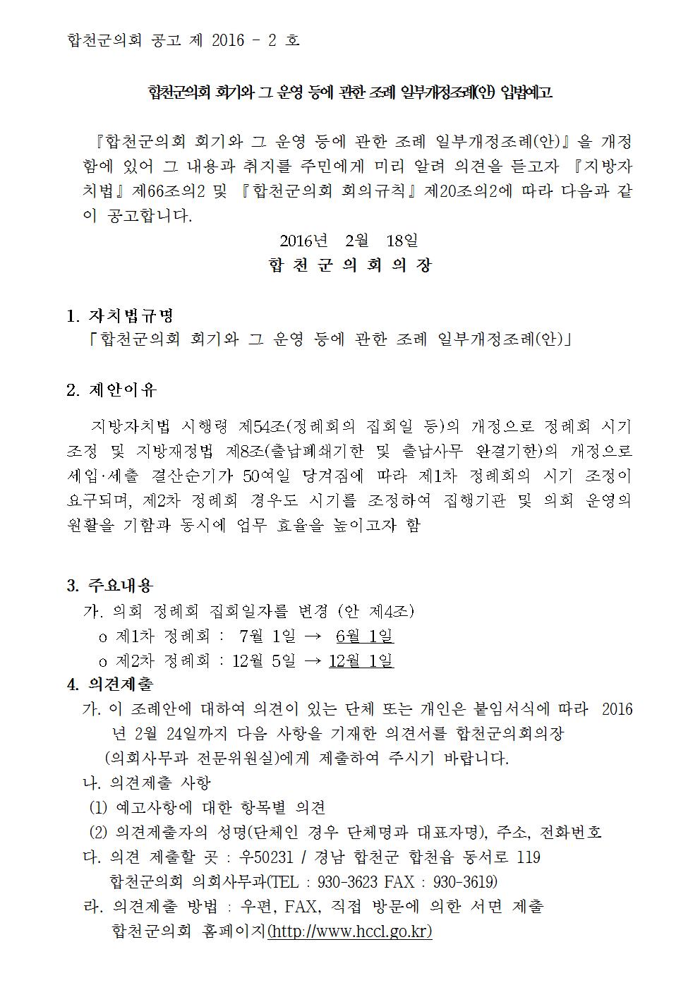 | 제목 | 합천군 회기와 그 운영 등에 관한 조례 일부개정조례안 입법예고 | ||||
