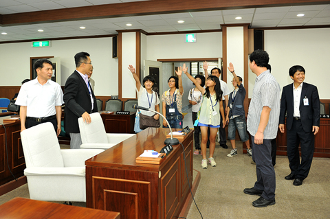 일본 미토요시 중학생 홈스테이 참가 학생들이 홈스테이 일정을 마치고 합천군의회를 견학. 이용균 복지행정위원장이 의장님을 대신하여 방문단을 접견하고 의회를 안내. |