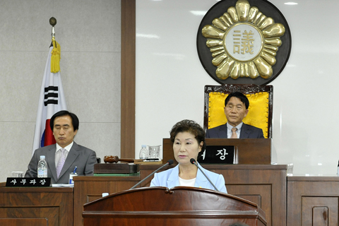 제7대 합천군의회 의회운영위원장에 최정옥의원이 당선되어 인사말씀을 하고 계십니다.