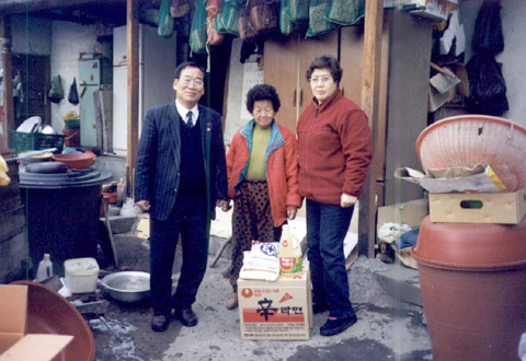 불우이웃에게 설위문품 전달시 회원과 함께.