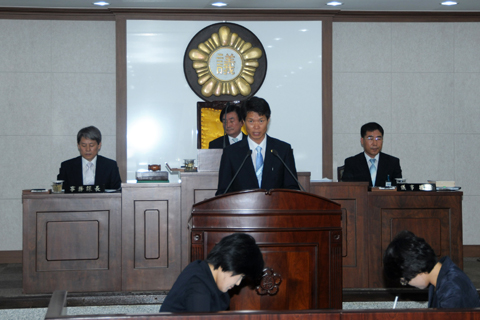 제166회 합천군의회 제1차 정례회에서 정종석의원이 다문화 가정의 지원에 대한 군정질문을 하고 있다.