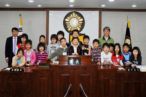 2012년 4월 25일 오전 합천군의회를 방문한 대병초등학교 학생들이 본회의장을 둘러본 후 기념촬영.